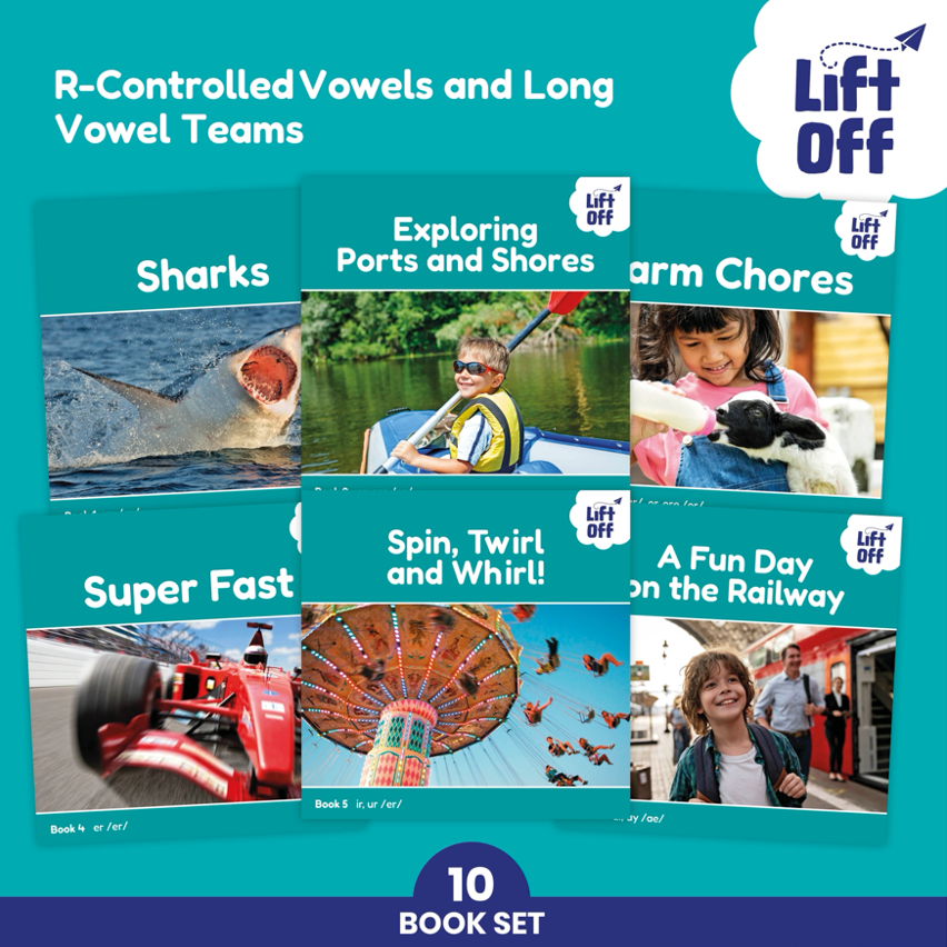Aligned to the University of Florida Literacy Institute (UFLI) Foundations phonics programme, Phonic Books Lift Off Readers: R-controlled Vowels and Long Vowel Teams comprises 10 non-fiction books and is aimed at children aged 6-8.