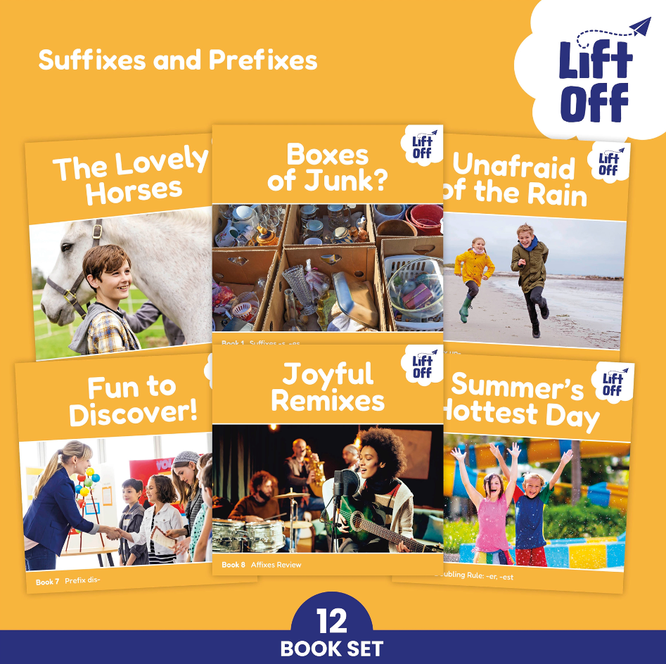 Aligned to the University of Florida Literacy Institute (UFLI) Foundations phonics programme, Phonic Books Lift Off Readers: Suffixes and Prefixes comprises 12 non-fiction books and is aimed at children aged 7-11.
