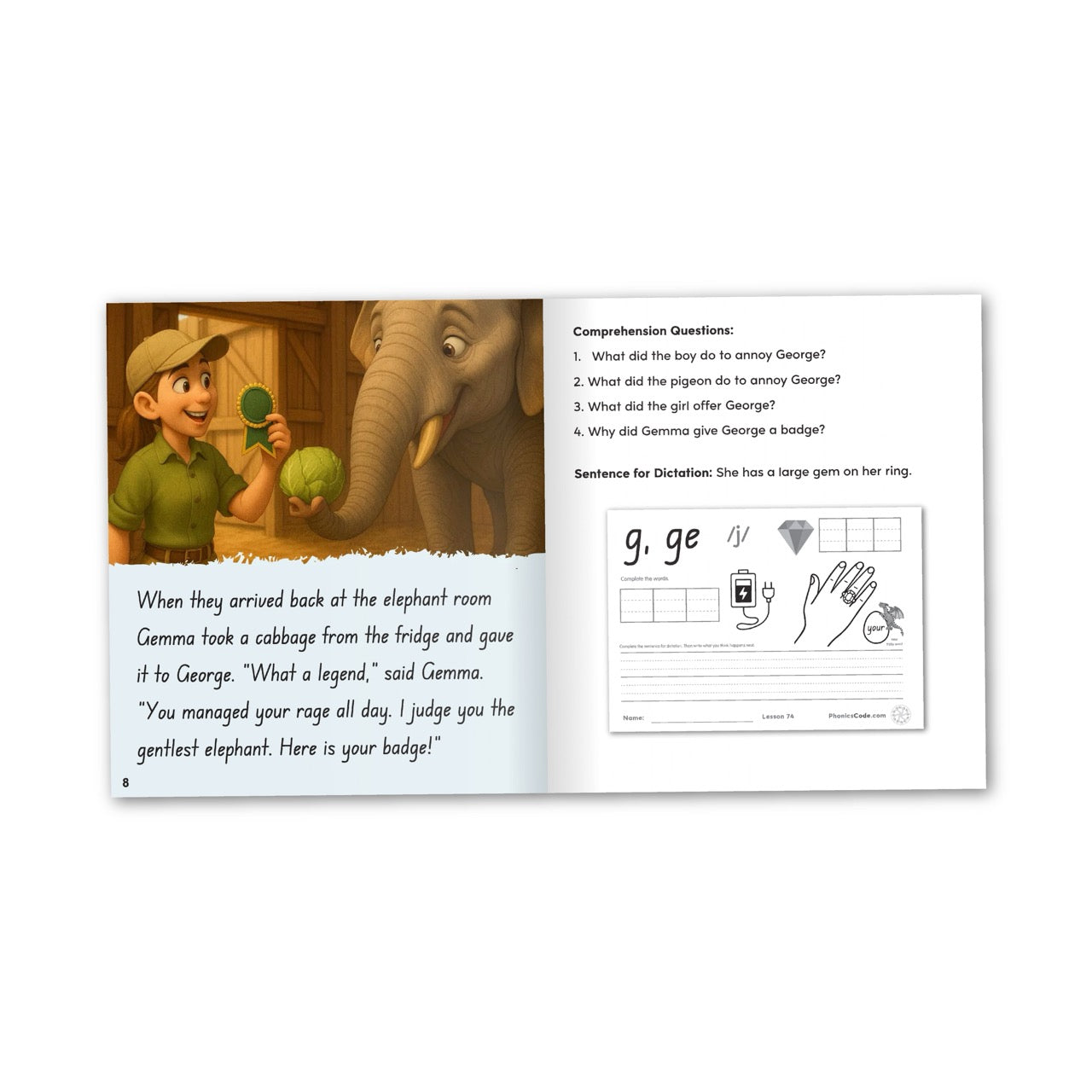 Phonics Code Book 74 introduces the spelling 'g' and 'ge' for the /j/ sound