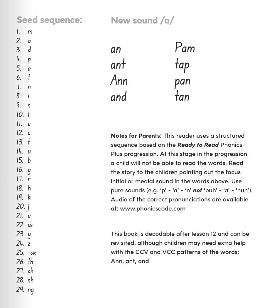 The book is decodable after lesson 18 and can be revisited by children.