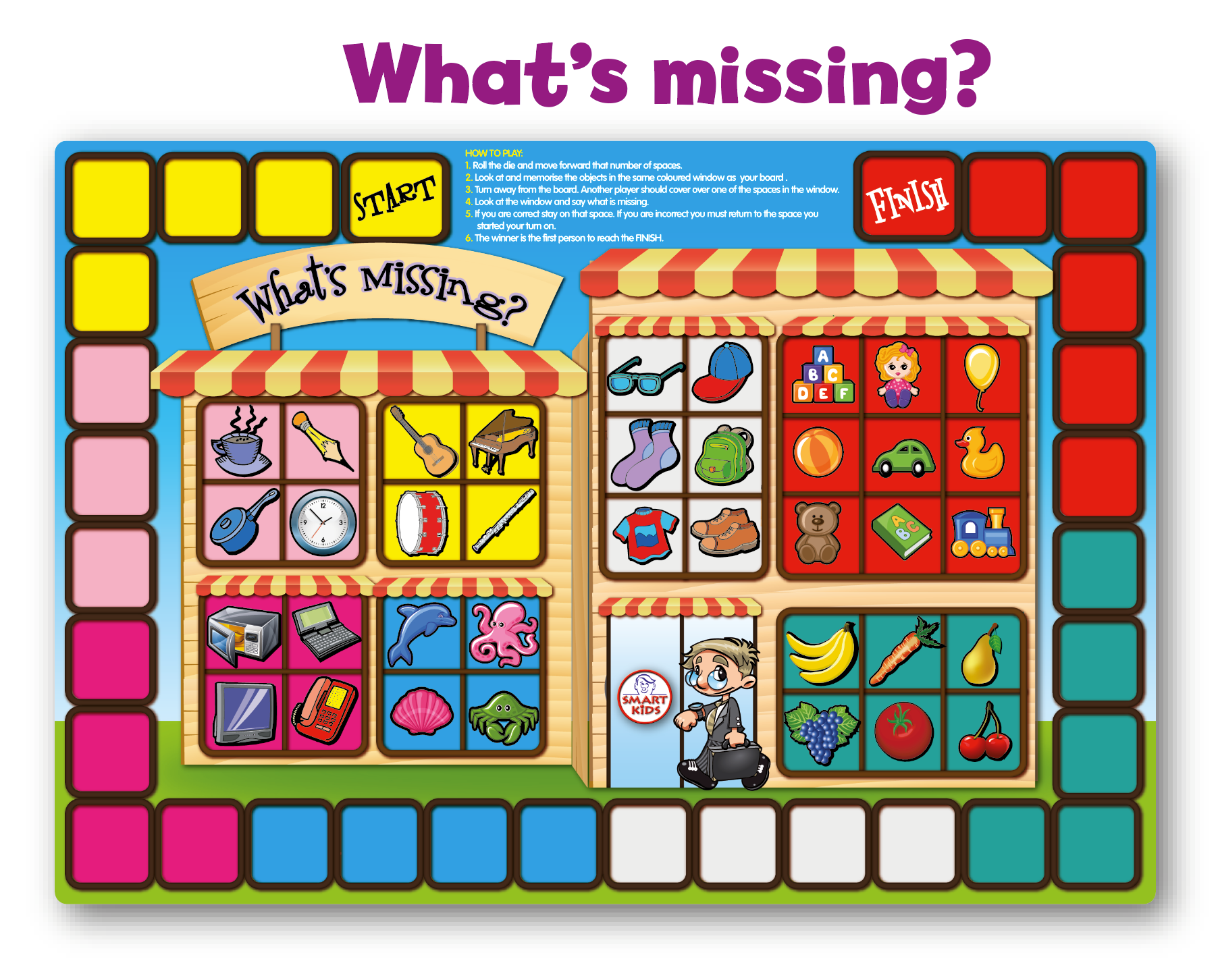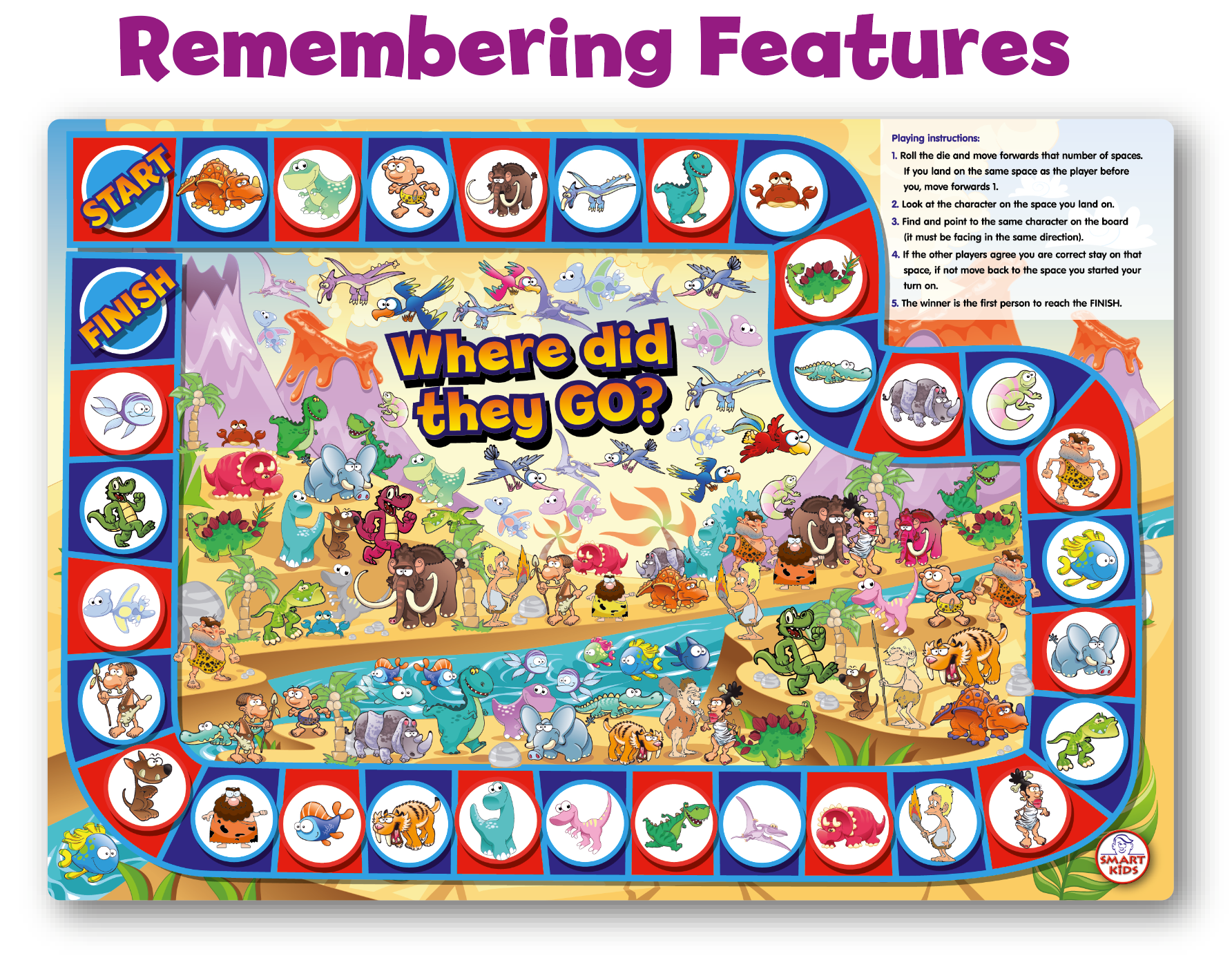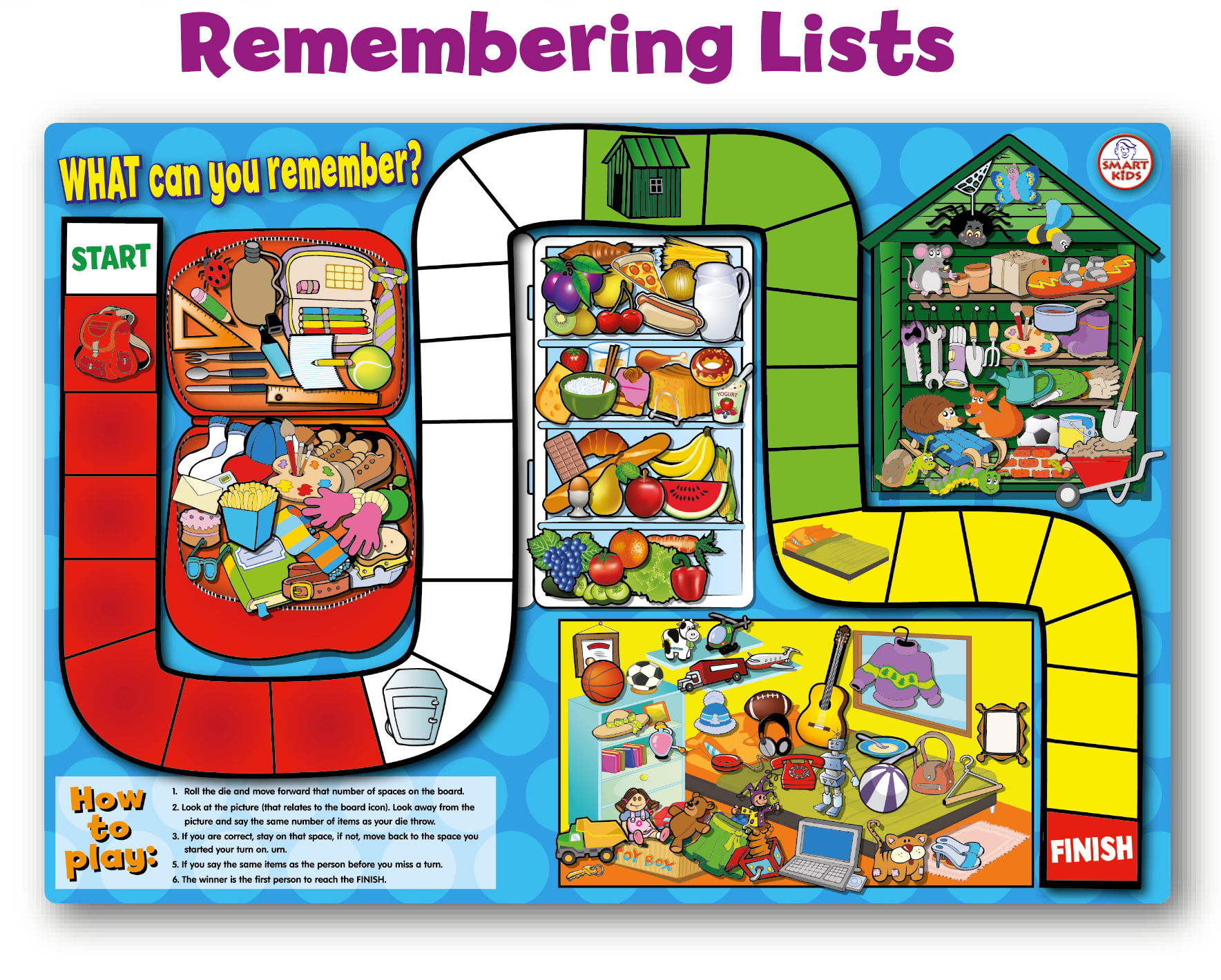 Memorise, Match and Spot the Difference with this revolutionary set of 6 x A3 Memory Skills Board Games! Practise linking techniques for memorising lists; spot picture differences and visually match the same cavemen and dinosaurs to move around exciting game boards. If that's not enough for one set, the other 3 games contain opportunities to memorise patterns, position and pictures. Don't forget to tell everyone you know about these brilliant new games, with everything you need to play included in the box. Fun for all ages! Minimal Reading Required - once the instructions have been read, all you need to do is play and have fun!