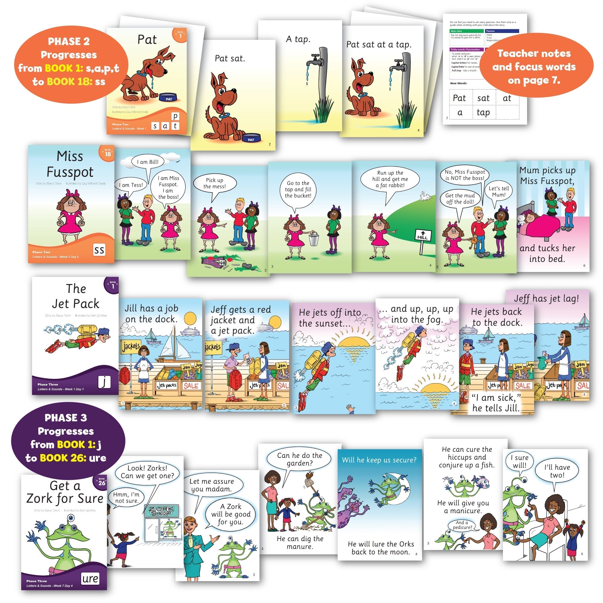 Introduce an early love of reading with these exciting readers. There are 18 fun stories to introduce, in a daily progression, the 18 phonemes learnt at Phase Two of Letters and Sounds. The books include an instructional page with comprehension questions as well as tricky and focus words.