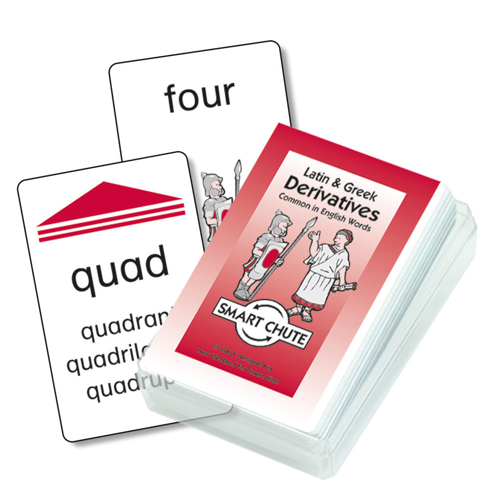 This pack of cards will fascinate students, showing them how so many words in the English language derive from Latin and Greek roots. Student?s read a list of words with a common root word, then guess its meaning. A picture of a Roman soldier or Greek scholar indicating the origin of each word accompanies each answer.