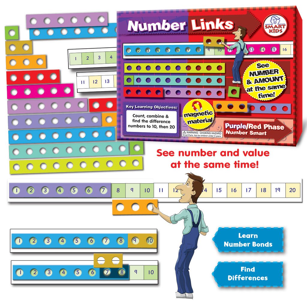 These revolutionary Number Links make linking counting, calculating and amounts to their represented numbers easy. Simply take a magnetic 'Number Link' and place over the specially sized number track (to 10 or 20) to provide a powerful visual & mental image when calculating. Practise number bonds by adding colour-coded Number Links together or practise subtraction and find differences by placing the Number Links over one another, before they are placed on to the number track. Colour-coding used is consistent throughout all Smart Kids Place Value resources. Contains: 40 Magnetic 1-10 Number Links; 4 x 1-10 magnetic Number Tracks (or 2 x 1-20) & 1-10 spinner. A variety of activity ideas are included on the box. Ages 4+ and perfect for SEN.