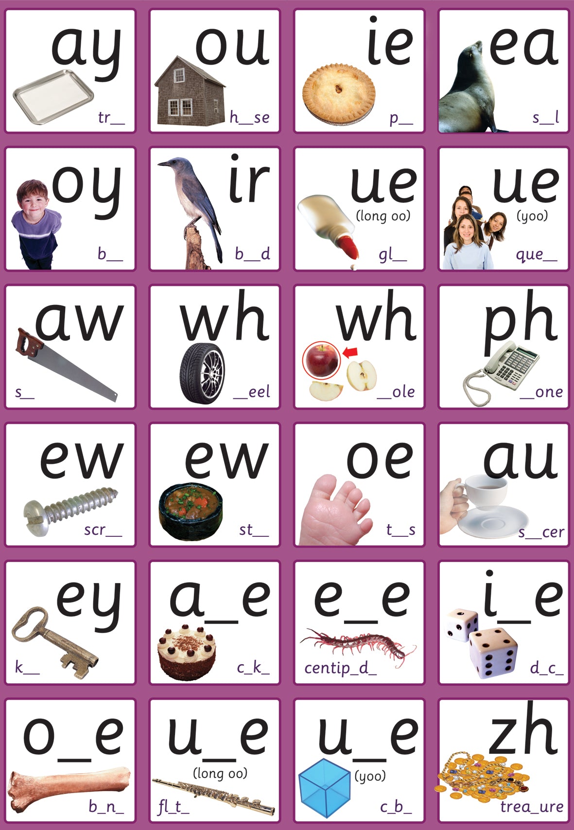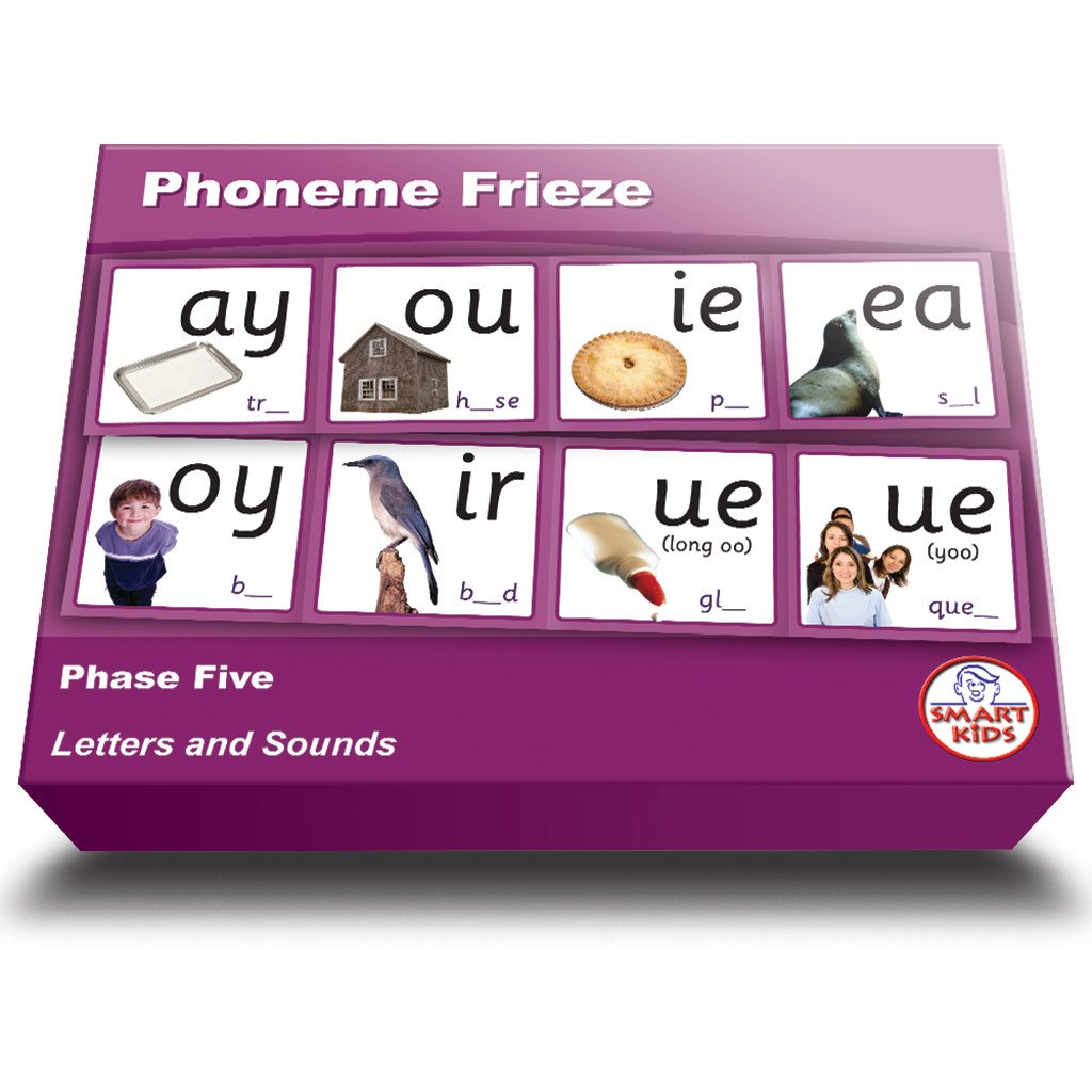 This frieze represents the Phase Five phonemes of Letters and Sounds in the progression that they are introduced, along with photographic mnemonic images. The frieze comes in a box so the phonemes that have not yet been taught can be stored until introduced.